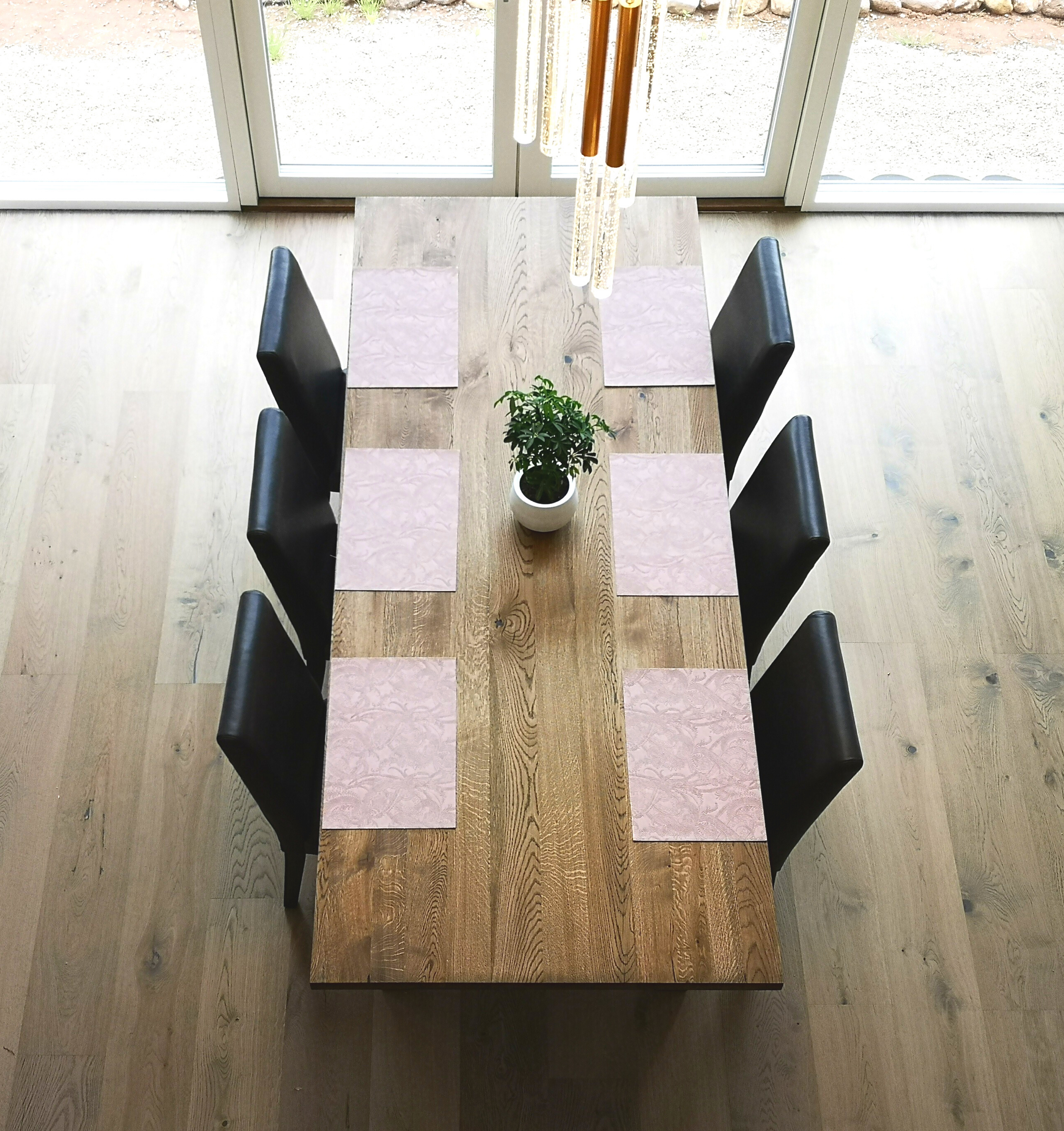 Servatud äärtega söögilaud, mille praod ja oksakohad on täidetud musta termopahtliga. Täidise abil muutub laua tasapind siledaks ning isegi kõige pisemad ebatasasused kaovad. Laua stabiilsuse tagavad tugevad metallist lauajalad.